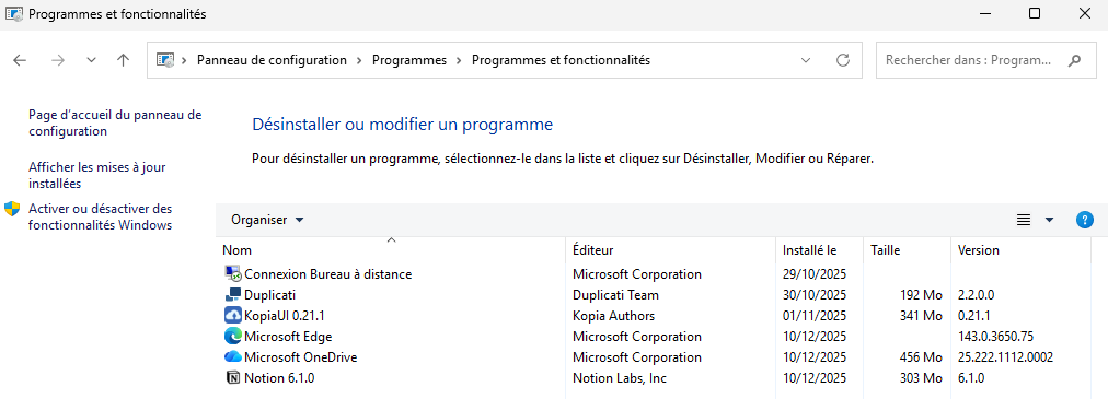 - Par la suite, vous remarquerez que le programme n'est plus affiché dans la liste, et s'est donc bien désinstallé avec succès et sans problème.