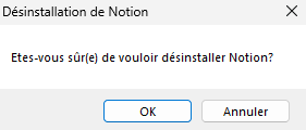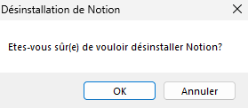- Un second message vous demandant d'être sûr de vouloir désinstaller l'application en question, si vous êtes bien sûr, sélectionner "OK", dans le cas contraire, sélectionner "Annuler".