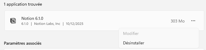 - Dans mon cas, je souhaite désinstaller Notion. Une fois l'application repérée, faites un clic gauche sur les trois petits points comme montré ci-dessous. Puis sélectionner "Désinstaller".