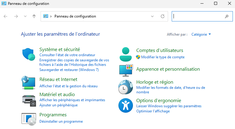 - Tapez dans la barre de recherche “Panneau de configuration”. Ou en tapant “control” en appuyant sur la touche ⊞ Win + R de votre clavier.