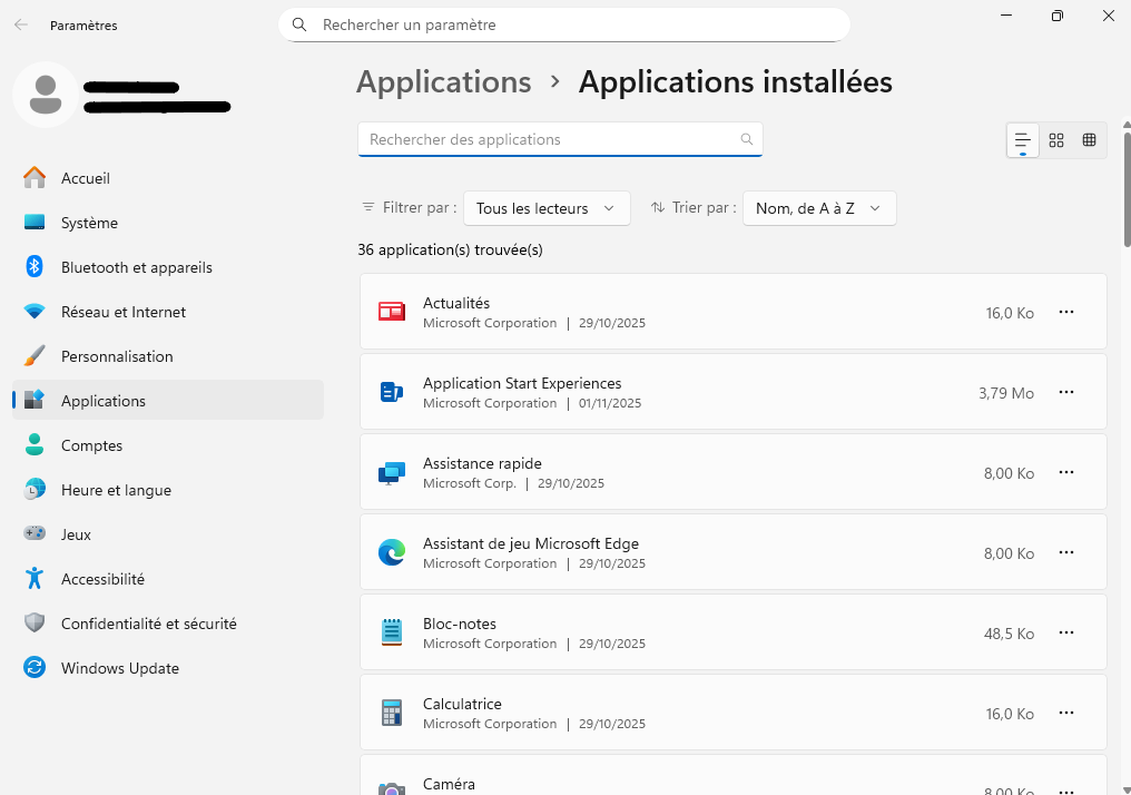 - Apparaîtra une liste de toutes vos applications et logiciels installés sur votre ordinateur, il vous suffira de rechercher l'application que vous souhaitez désinstaller depuis la barre de recherche ou en défilant la liste vers le bas.