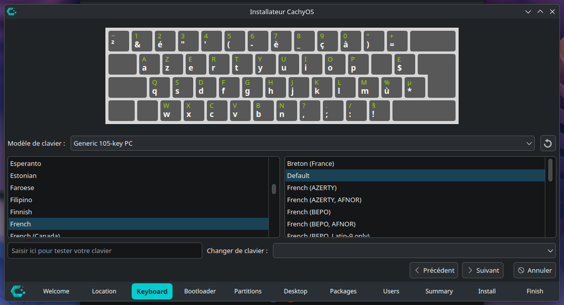 Toujours dans les paramètres de langues, vous pouvez choisir la disposition de votre clavier dans les listes déroulantes, une disposition peut être présélectionnée en fonction des paramètres de langue choisis précédemment.