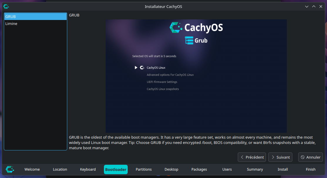 - Limine : Il s'agit d'un bootloader plus moderne, il a été adapté par les développeurs de CachyOS pour ce dernier, il prend nativement en charge le système de snapshots du système de fichiers BTRFS, et intègre également une prise en charge du multiboot.