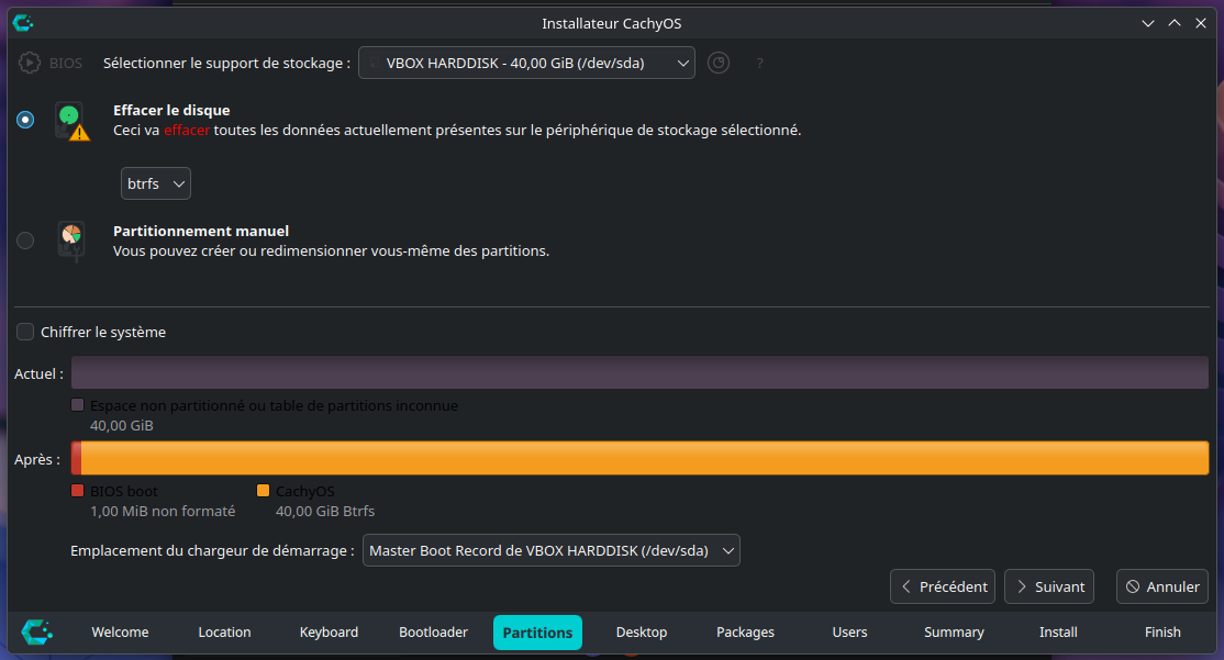 Il en existe différents types sous Linux (comme le ext4, btrfs, xfs, zfs, f2fs...), CachyOS recommande par défaut le système de fichiers BTRFS. Ce dernier permet de faire des Snapshots (une sauvegarde de l'état du FS au moment ou elle est effectuée) afin de pouvoir restaurer ce dernier en cas de problème (notamment lors d'une mise à jour mal exécutée par exemple).