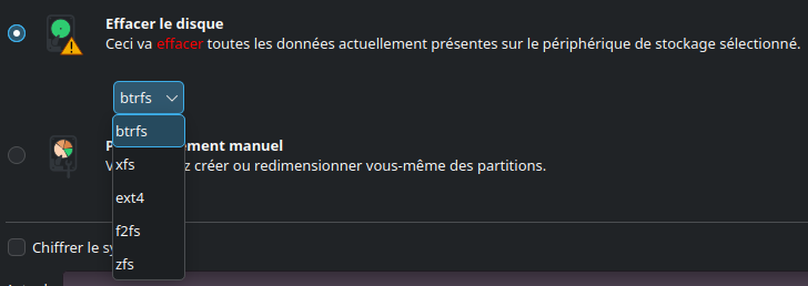 Comme vous l'avez sûrement constaté, un bouton de liste déroulante est apparu sous l'option choisie, il s'agit du choix du système de fichier (appelé aussi "FS").