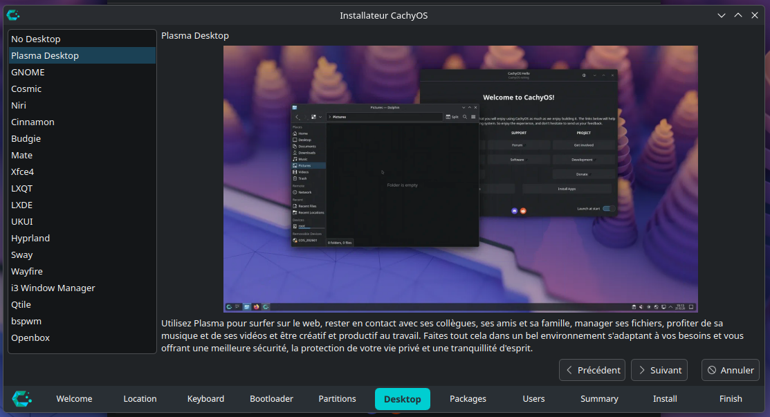 Un environnement de bureau est l'interface utilisateur que vous verrez constamment lors de l'utilisation de votre appareil, CachyOS propose un large choix d'environnements (notamment les plus connus : KDE Plasma, Gnome, Xfce, Mate...) avec une image d'illustration ainsi qu'une description de l'environnement sélectionné.