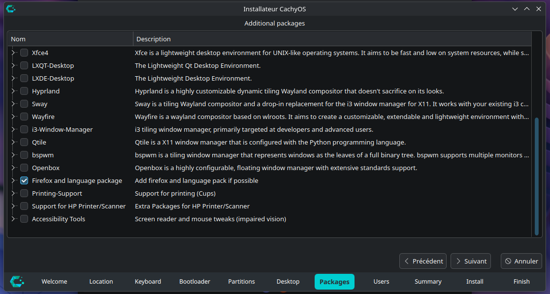 Après le choix de votre environnement de bureau, l'installateur vous propose différents paquets supplémentaires qu'il est possible d'installer comme par exemple un navigateur web (sélectionné par défaut), des outils pour le support d'imprimantes, ou encore des outils d'accessibilité, une fois votre choix de paquets à télécharger fait, vous pouvez continuer en cliquant sur Suivant.