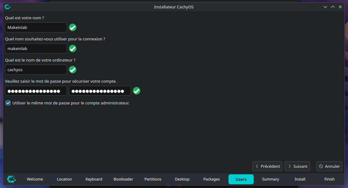 Sous les champs de saisie du mot de passe, vous pouvez décocher, l'option "Utiliser le même mot de passe pour le compte administrateur", si vous souhaitez utiliser un mot de passe différent pour le compte super-utilisateur "root" (à noter qu'il est très important de retenir ce mot de passe, il sera très compliqué de pouvoir accéder à nouveau à votre système en cas de perte de ce mot de passe).