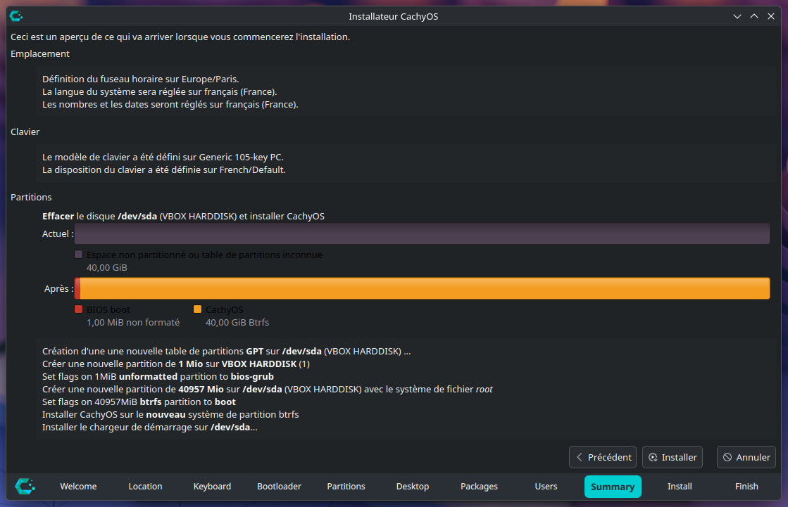 Nous arrivons sur la fin de la configuration de CachyOS, l'installateur vous affiche alors un résumé de la configuration que vous avez choisi, si la configuration présentée correspond à vos choix précédents, vous pouvez alors lancer l'installation en cliquant sur Installer.