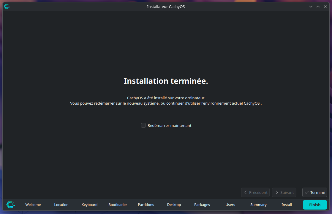 Une fois l'installation terminée, l'installateur vous l'informe, et vous propose de redémarrer votre appareil en cochant la case "Redémarrer maintenant" afin d'utiliser votre nouveau système CachyOS, vous pouvez également choisir de ne pas cocher cette case pour pouvoir continuer de tester le système d'exploitation. quel que soit votre choix, vous pouvez cliquer sur Terminé afin de redémarrer votre appareil, ou de fermer cette fenêtre.