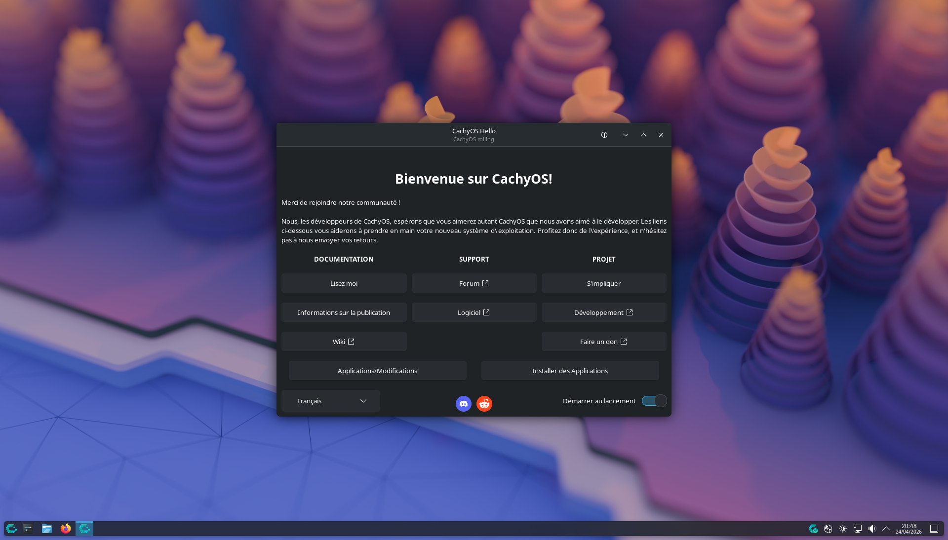 Ce premier démarrage peut être plus ou moins long selon votre appareil dû à l'initialisation du système, une fois démarré et après vous être authentifié avec les identifiants créés précédemment, vous pouvez alors enfin découvrir votre nouveau bureau ainsi qu'une fenêtre d'accueil vous permettant de découvrir plus amplement votre système :