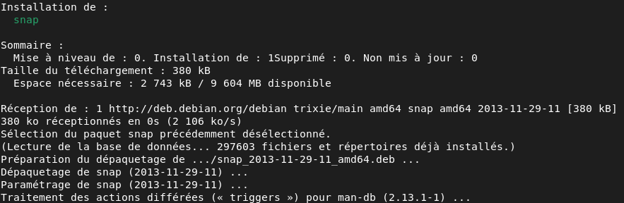 Avec les paquets snap, ceci est légèrement différent qu'avec les formats deb, car n'est pas installé par défaut sur le système Debian.
