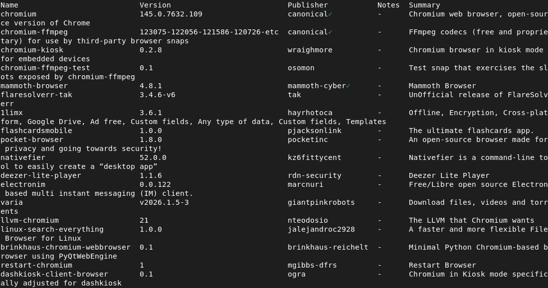 Ensuite, pour installer un logiciel au format snap, on peut déjà faire une recherche spécifique afin de savoir si le paquet est bel et bien disponible avec la commande snap find <nom_du_paque> :