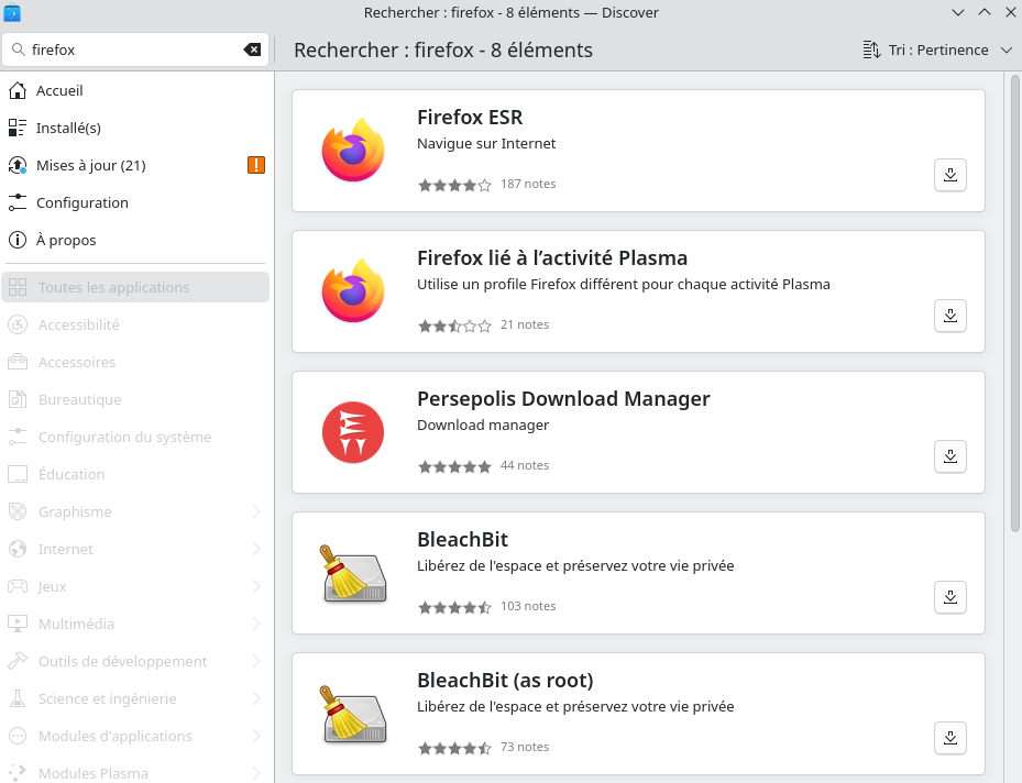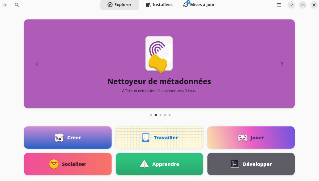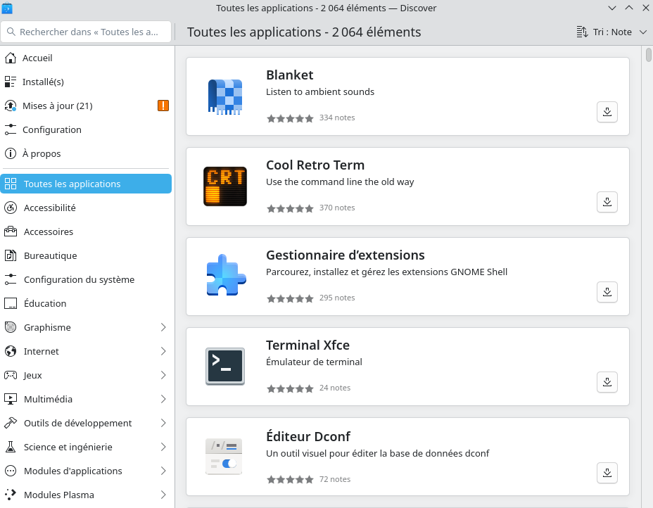 Une fois sur le centre d'applications Discover, vous pouvez soit rechercher un logiciel spécifique directement via la barre de recherche située en haut à gauche, soit en recherchant via les différents onglets par type d'application situé sur la barre de gauche :