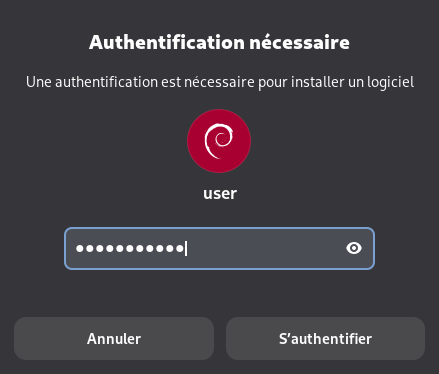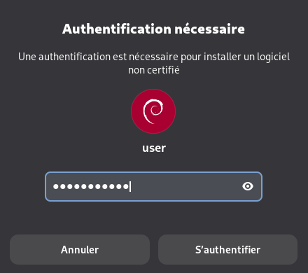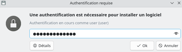 Une fenêtre s'ouvrira, vous demandant d'entrer le mot de passe de l'utilisateur de la session actuelle afin d'autoriser l'installation du logiciel. Puis cliquez sur "Ok".