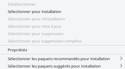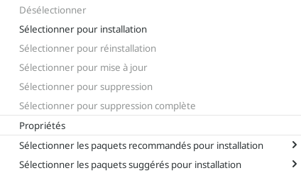 Pour installer un paquet, il faudra faire un clique droit sur le paquet > "Sélectionner pour installation" :