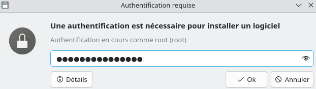 Une fenêtre s'ouvrira, vous demandant d'entrer le mot de passe du super-utilisateur root de l'ordinateur afin d'autoriser l'installation du logiciel. Puis pour valider, cliquez sur "Ok".