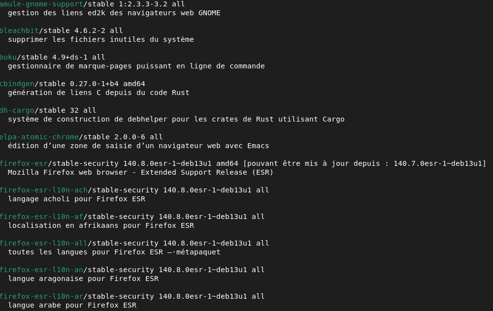 sudo apt update -yEnsuite, si vous voulez rechercher un logiciel afin de savoir s'il est bien disponible afin de l'installer sous le format deb, vous pouvez exécuter la commande apt search <nom du logiciel> :