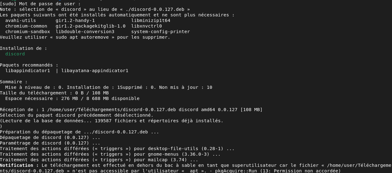 Une fois situé dans le bon répertoire, il faudra installer le paquet avec la commande apt install ./<nom_du_logiciel.deb> :