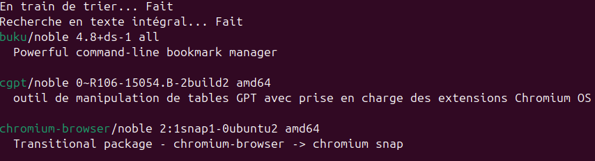 sudo apt updateEnsuite, si vous voulez rechercher un logiciel afin de savoir s'il est bien disponible afin de l'installer sous le format deb, vous pouvez exécuter la commande apt search <nom du logiciel> :
