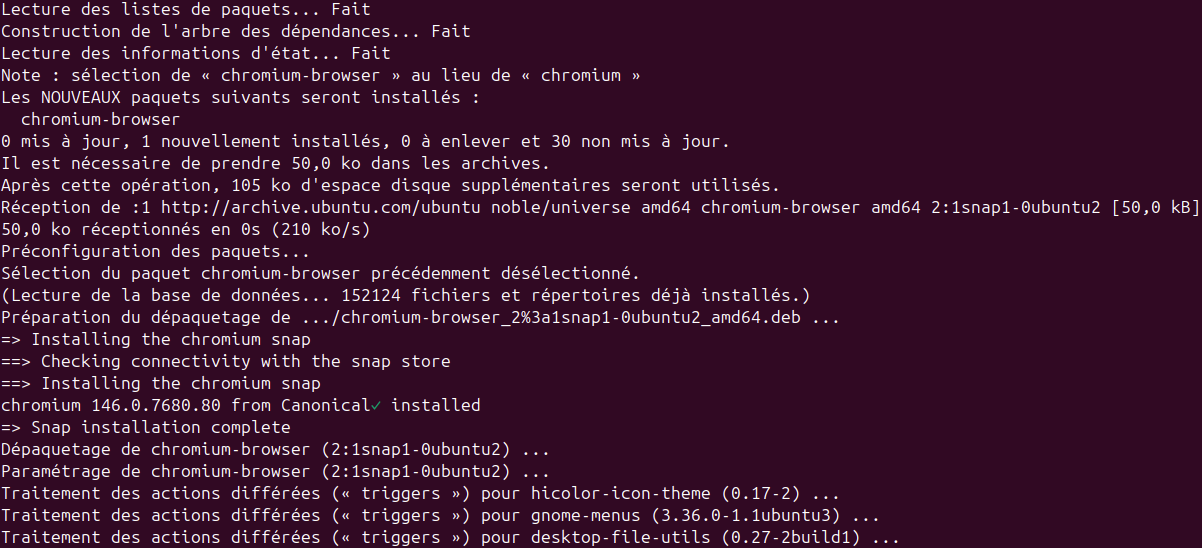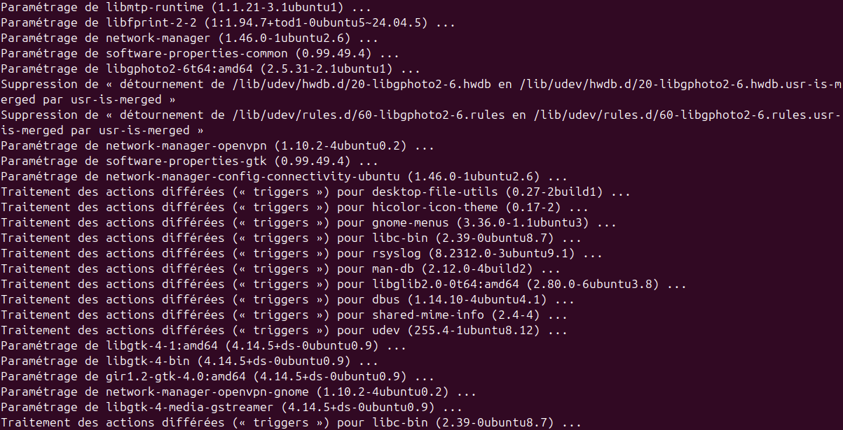 Puis le logiciel s'installera. Un retour de commande apparaîtra vous indiquant que le logiciel a bien été installé.