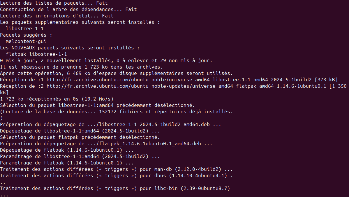 Pour les logiciels au format flatpak, celui-ci est un système de paquets libre dédié à la gestion des paquets sur Linux et présent sur Ubuntu. Il est uniquement dédié et réservé aux applications de bureau, donc via un système sous interface graphique, mais pouvant être utilisé via ligne de commande afin de gérer les paquets.