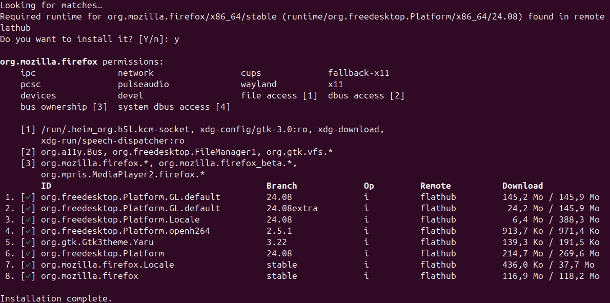 Puis par la suite, pour installer par exemple Firefox, il faudra récupérer son identifiant, dans le cas de Firefox, son identifiant est org.mozilla.firefox . Donc la commande à exécuter est flatpak install id.du.logiciel .