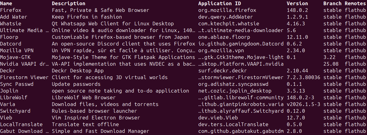 flatpak run org.mozilla.firefoxPar la suite, si vous souhaitez mettre à jour les applications flatpak installées, exécutez la commande :