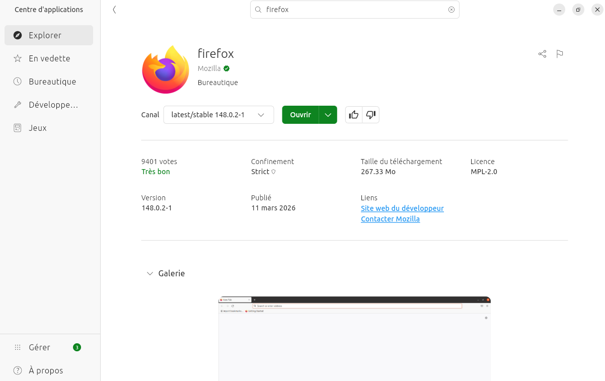sudo snap install firefoxUne demande d'authentification sera nécessaire, il faudra alors y entrer le mot de passe de l'utilisateur actuel.
