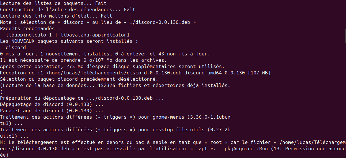 Une fois situé dans le bon répertoire, il faudra installer le paquet avec la commande apt install ./<nom_du_logiciel.deb> :
