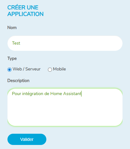 Une page va alors s'ouvrir, pour remplir des informations. Ces informations sont purement indicative pour être plus visuelles sur votre profil. Il faut entrer le nom, sélectionner le type, pour notre cas il s'agit d'un serveur. Puis pour finir une description la plus basique qu'il soit. Une fois ces champs remplit, il suffit juste de cliquer sur "Valider".
