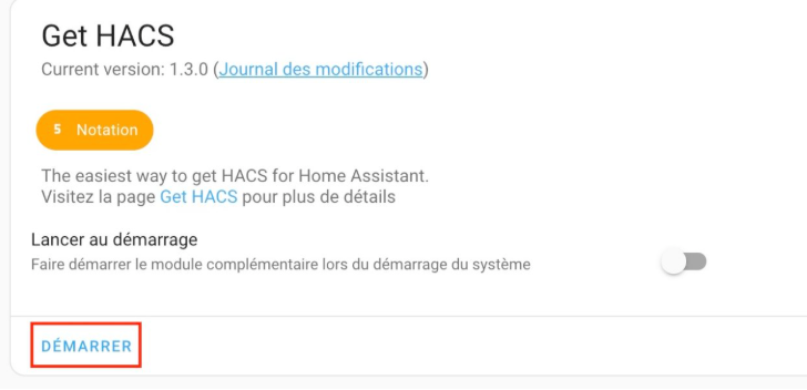 Maintenant que l’add-on Get HACS est installé, il ne reste plus qu’à le démarrer pour commencer à récupérer le nécessaire à l’installation de HACS sur votre domotique.