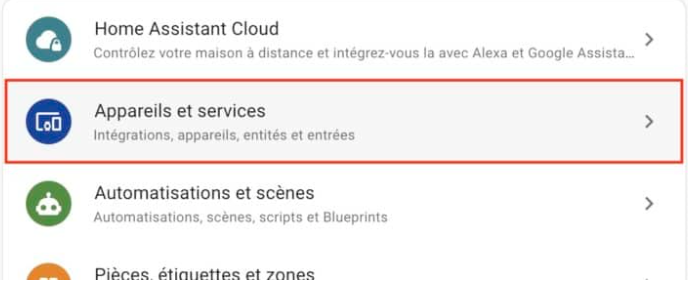 Pour ce faire, rendez-vous dans le menu Paramètres/Appareils et services de votre Home Assistant.