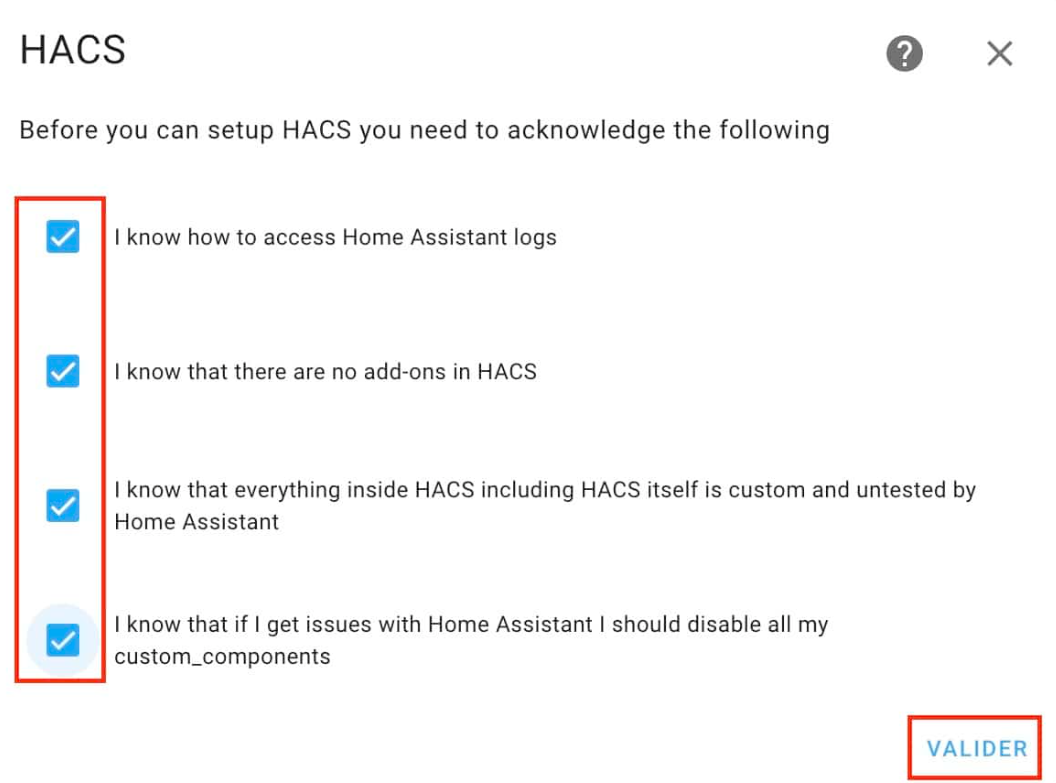 Valider les conditions d’utilisation de HACS