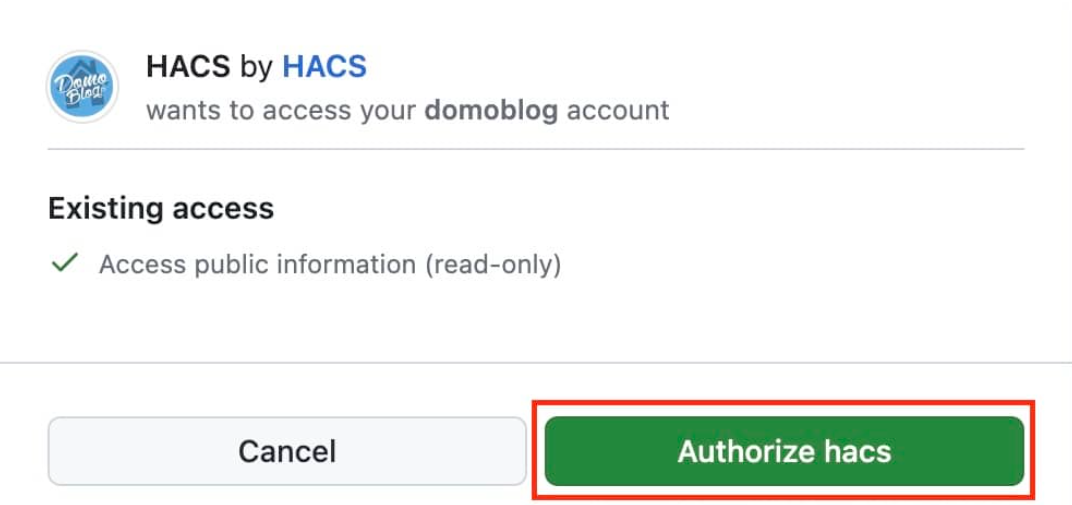 Il ne reste plus qu’à confirmer via le bouton Authorize hacs pour finaliser le lien entre HACS et votre compte Github.