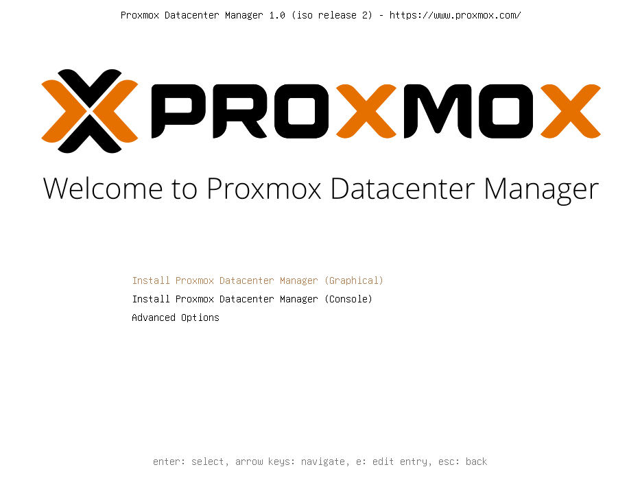 Au lancement de l’ISO, un menu s’affiche avec plusieurs options. Il suffit généralement de sélectionner « Install Proxmox Datacenter Manager (Graphical) » afin de démarrer l’installation standard.