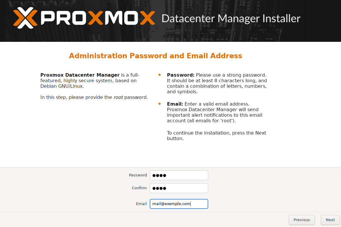 L’installation demande ensuite de définir un mot de passe pour l’utilisateur root ainsi qu’une adresse email. Cette dernière sera utilisée pour recevoir les alertes système si vous avez configuré un système de notification par mail derrière !