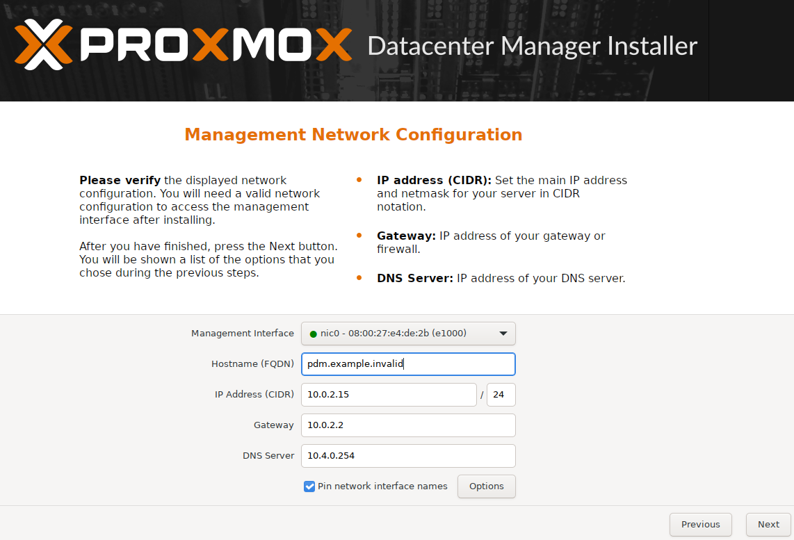 La configuration réseau est une étape essentielle. Elle consiste à renseigner l’adresse IP (de préférence en statique), le masque réseau, la passerelle, le DNS ainsi que le nom d’hôte du serveur, par exemple pdm1.local. Il est important d’utiliser une configuration réseau stable, notamment dans le cadre d’un cluster.