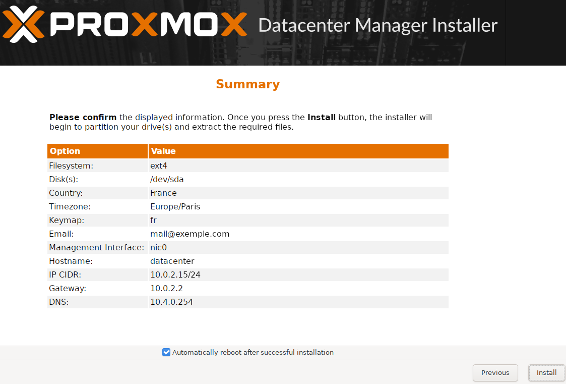 Vous pouvez cocher la case qui permet au système de redémarrer automatiquement une fois l’installation terminée, évitant ainsi une intervention manuelle et assurant une mise en service immédiate du datacenter manager.