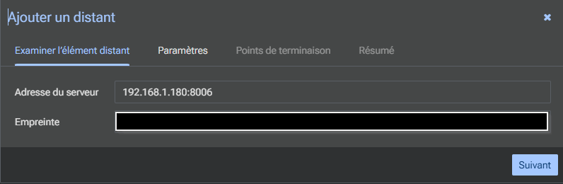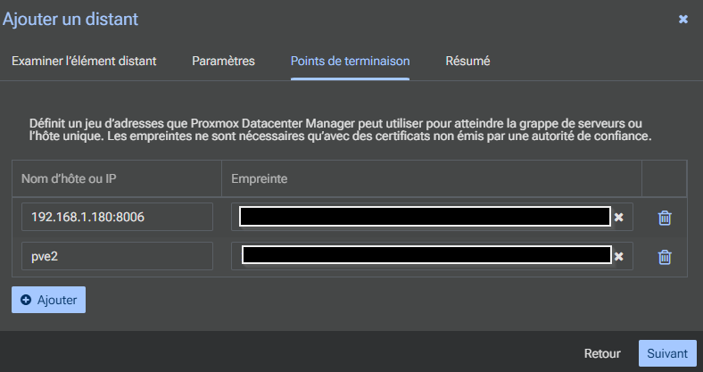 Ensuite la fenêtre d'ajout va s'ouvrir, il faut entrer l'adresse IP suivit du port du serveur. il faut également récupérer l'empreinte du Proxmox que vous souhaitez ajouter.