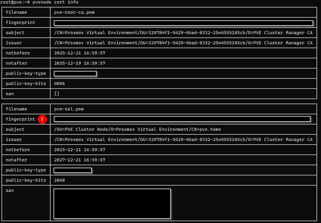 pvenode cert infoCette commande permet de retourner les informations du certificat, notamment son empreinte SHA256, sa date de validité et ses détails.