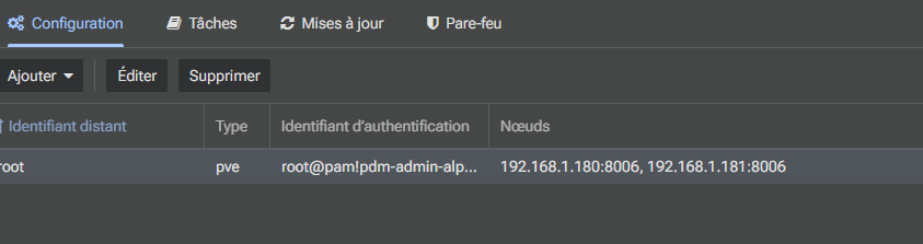 - Lors de l’ajout d’un serveur dans Proxmox Datacenter Manager, il n’est pas nécessaire de renseigner tous les nœuds d’un cluster individuellement. Lorsqu’un premier nœud est connecté, les autres serveurs appartenant au même cluster Proxmox VE remontent automatiquement.