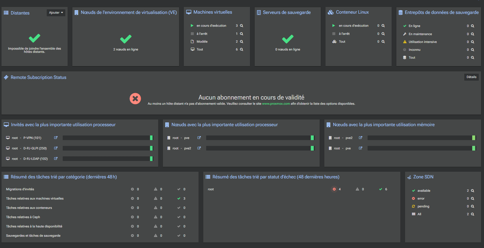 Ces sections permettent de surveiller les opérations récentes (migrations, actions sur VM, conteneurs, Ceph, etc.).